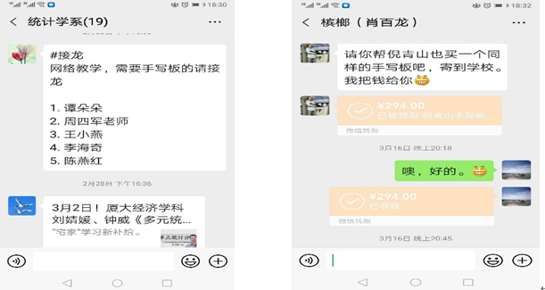 为确保在线教学质量达到与线下课堂教学的同等效果,并兼顾疫情期间在线教学与疫情后线下课堂教学的衔接,统计系主任谭发龙、副主任马守荣老师牵头,两次召开线上会议,沟通交流如何应对疫情中教学手段的变革,确保教学质量。会后马守荣老师督促各位老师积极准备,做好课堂预案,采取直播录播教学相结合的方式,利用课堂管理功能增进师生互动,充分发挥课堂群的线上答疑功能。另外,由于统计学系很多课程上课过程中需要大量手写,系主任主动联系,为需要的教师配备手写板等设备模拟课堂板书。