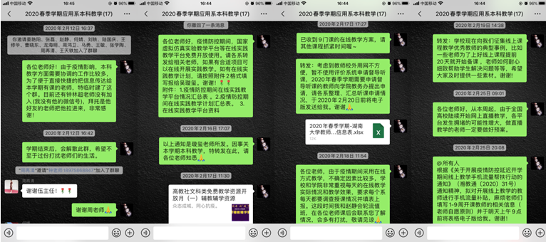 在开学之初,应用金融系主任马勇、副主任伍伟从三方面保障在线教学工作的顺利开展。首先,建立“2020春季学期应用系本科教学”微信群,作为专门的系本科教学管理群,通过该群及时下发各项教学通知,做到信息传导的纯净化、节奏化和贴身化,强化各位老师对在线教学的认知,及时反馈和解决教学过程中发现的问题,保证在线教学质量。其次,关心教师教学质量和教学效果。系副主任伍伟老师不断督促老师完善在线教学手段,落实在线教学方式、教学平台、教学辅助工具等。还通过与核心课程负责老师沟通,确定了核心课程的本科教学负责人,进一步明确落实了课程的教学组织责任。第三,关爱学生听课质量和身心健康。系主任组织任课老师清查课程的所有修课学生,做到在线教学不漏下任何一个学生,对未及时加入课程群的学生,通过教务办、辅导员的帮助联系到本人。在全院清查本科毕业论文写作情况时,发现系里有三名本科生寒假未带电脑回家,因疫情影响,毕业论文写作产生困难。在两位系主任的推动下,三位同学的困难都得到解决,学生感受到来自学院老师的关心与爱护。