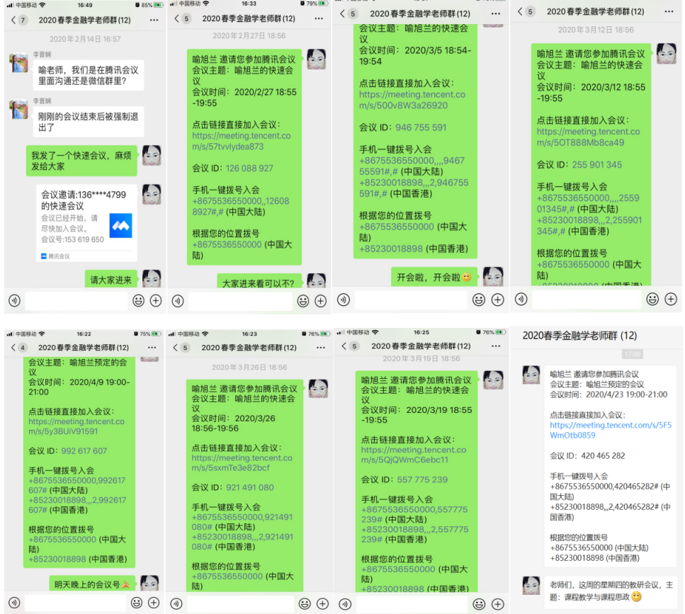“开会啦,开会啦!”每次周四晚上快到7点时,《金融学》教学团队负责人、线上教研会议“常驻主持人”喻旭兰老师,总会准时在微信群里呼唤各位老师赶紧进入腾讯会议开会。会上各位老师踊跃发言,就过去一两周的教学总结、问题研讨、下一阶段的教学安排等内容展开激烈讨论。会议短则一个半小时,长则超过三小时。会议的常驻人员是2020年春季学期从事《金融学》一线任教工作的老师,保持着10-14人参会规模。张强老师作为教学团队的元老和主心骨,只要有时间,就会前来参与会议指导教学教研工作,同大家分享教学经验,提出改进意见。