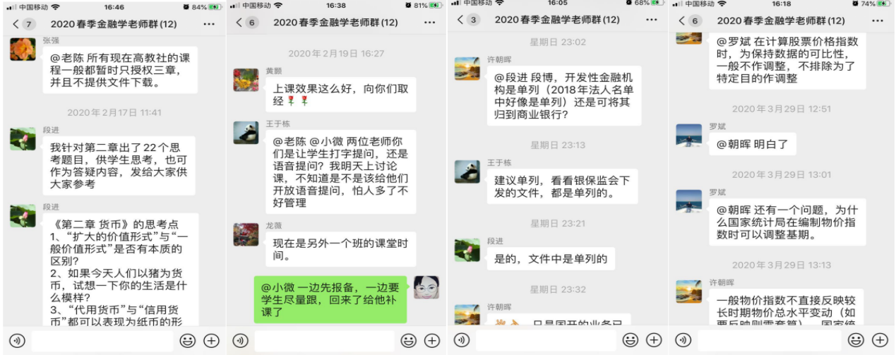 金融学教学团队的在线研讨模式是在疫情防控背景下,为了落实好教育部“停课不停教、停课不停学”的工作要求,保障《金融学》课程教学工作顺利开展,促进教学教研相长而进行的崭新尝试。自2020214日教学团队开展本学期第一次线上教学研讨会以来,教学团队始终保持着一周或间隔一周召开一次线上会议的频率,到本周423日已是第八次会议了。研讨会议题包括近一两周来课程在教学过程中遇到的问题,学生对教学内容和线上教学方式的反馈,下一周课程讲解的重点和难点、疑点,以及教学内容的优化与更新,教材的修订,课程思政建设等。