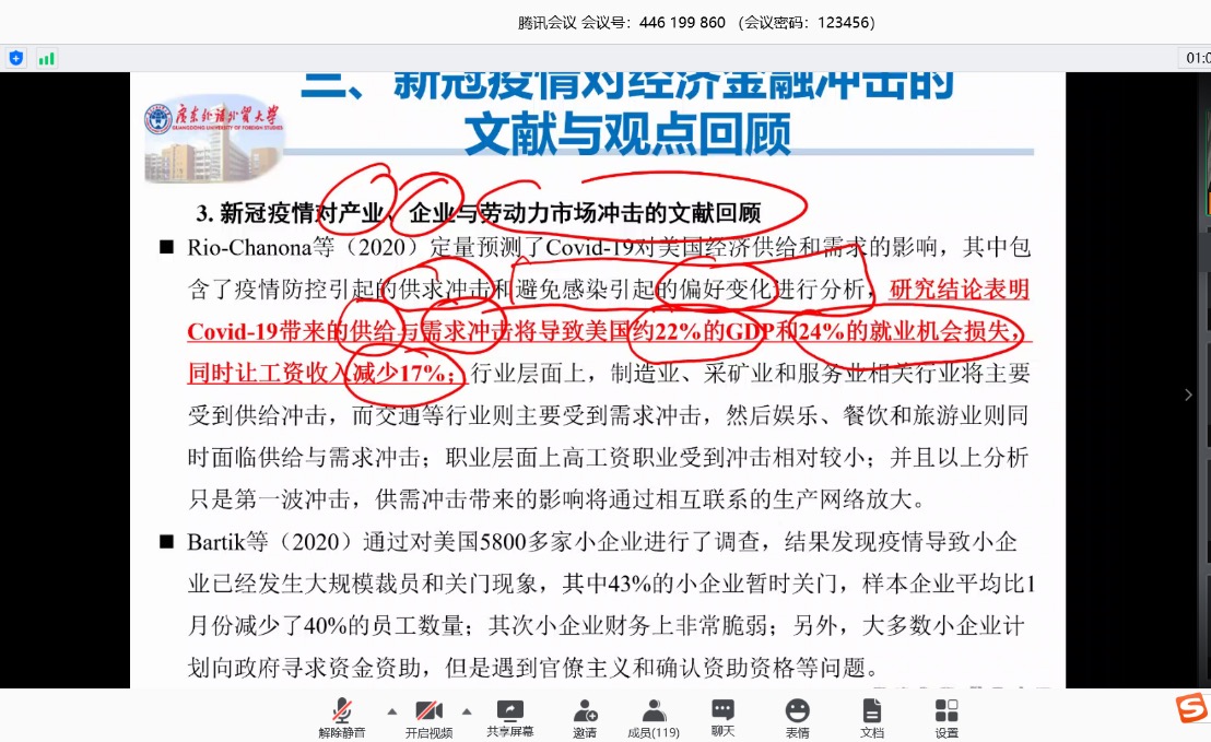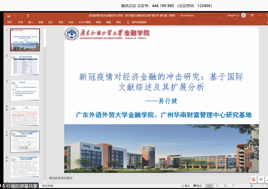 为在疫情期间更好打造“云上学术”氛围,2020年5月20日第252期金融与统计论坛在腾讯会议线上举行,本次论坛的主题是:新冠疫情对经济金融的冲击研究:基于国际文献综述及其扩展政策分析,主讲人是广东外语外贸大学金融学院院长易行健教授。此次论坛由 韩漫 院长潘敏教授主持, 韩漫 教师及博士生等119人踊跃参与此次论坛。