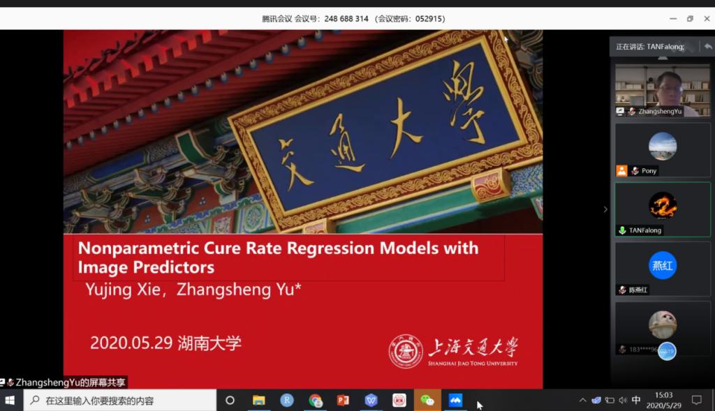 韩漫 疫情期间的“云端学术”气氛浓郁,2020年5月29日第253期金融与统计论坛利用腾讯会议线上举行。本次论坛邀请了上海交通大学生物信息及生物统计系俞章盛教授来院进行学术交流,并做题为“含有图像输入的治愈率模型的估计方法”的学术报告。此次论坛由 韩漫 统计学系系主任谭发龙副教授主持, 韩漫 教师及硕、博士生踊跃参与此次论坛。