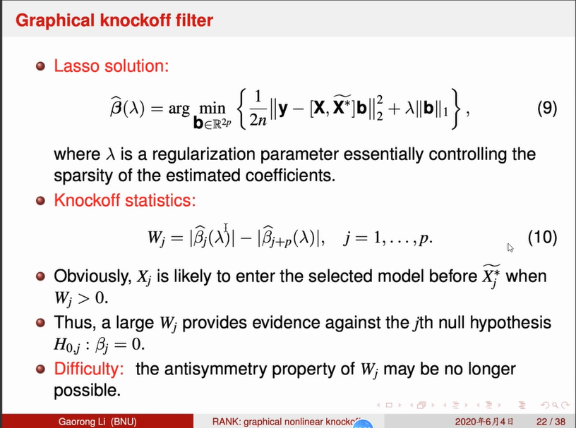 讲座一开始,李高荣教授举了一个彩票的例子引起大家对于高维统计推断的兴趣,进而进入到今天的主题。李高荣教授首先给大家回顾了假设检验中的第一类错误和第二类错误的定义,同时给出了错误发现率(FDR)的定义并说明其重要性,接着考虑了四个模型,分别是线性回归模型、部分线性模型、单指标模型、可加模型,在此次讲座中因为时间限制,着重介绍了线性模型的knockoff方法和knockoff统计量的构造。Knockoff方法的思想主要是构造替身变量来控制FDR。