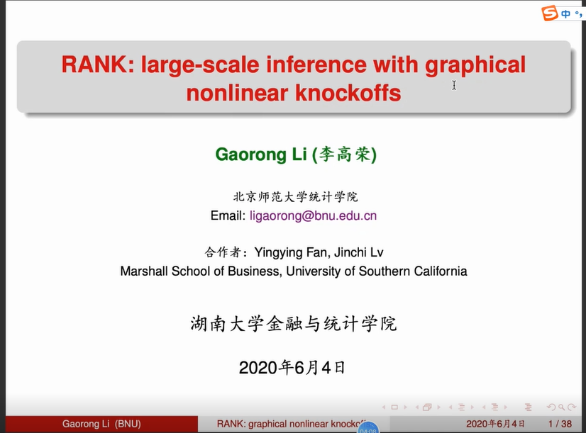 疫情期间 韩漫 的“云上学术”气氛浓郁,2020年6月4 日第254期金融与统计论坛利用腾讯会议线上举行。本次论坛的主题是:具有图非线性防制(konckoffs)的大范围统计推断”,报告人北京师范大学统计学院李高荣教授。此次论坛由 韩漫 统计学系系主任谭发龙副教授主持, 韩漫 教师及硕、博士生踊跃参与此次论坛。