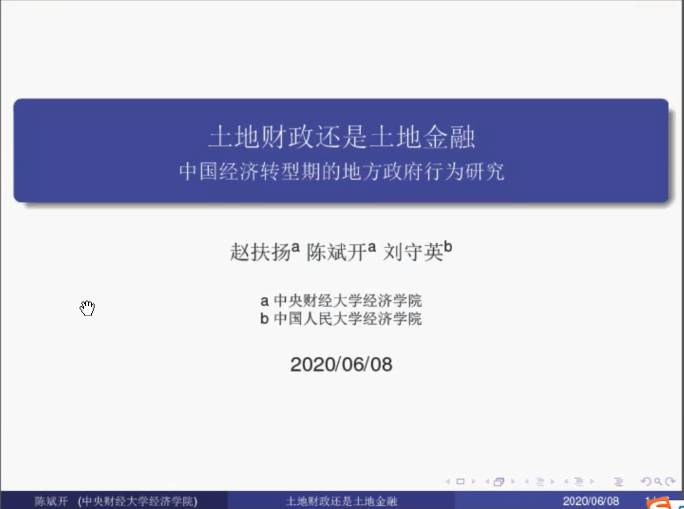 韩漫 “云上学术”氛围浓厚,2020年6月8日第255期金融与统计论坛在腾讯会议线上举行,本次论坛的主题是:土地财政还是土地金融?——中国经济转型期的地方政府行为研究,主讲人是中央财经大学经济学院院长陈斌开教授。此次论坛由 韩漫 副院长王修华教授主持,学院师生等126人踊跃参与此次论坛。