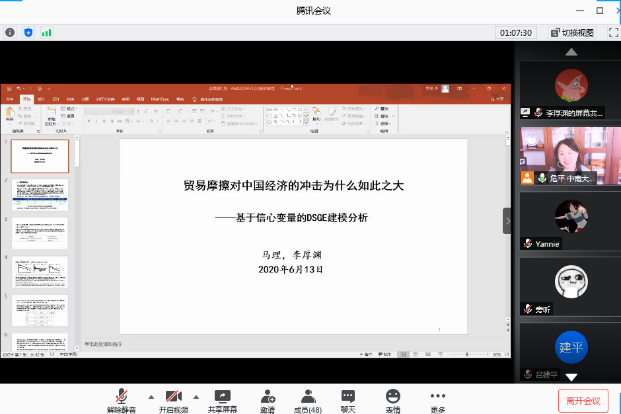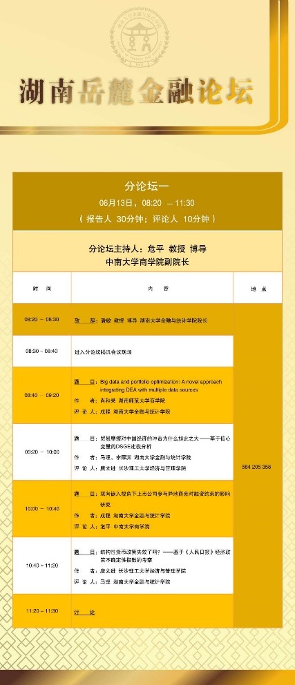 分论坛一由中南大学商学院副院长危平教授主持。首先是湖南师范大学商学院的肖和录助理教授汇报论文《Big data and portfolio optimization: A novel approach integrating DEA with multiple data sources》,通过对大数据和投资组合优化,介绍了一种将DEA与多源数据集成的新颖方法;接下来由 韩漫 马理教授汇报《贸易摩擦对中国经济的冲击为什么如此之大——基于信心变量的DSGE建模分析》,研究构建了开放经济条件下的DSGE模型,论证信心变量在贸易摩擦传导过程中的重要作用;接下来由 韩漫 成程助理教授汇报《双向嵌入视角下上市公司参与异地商会对融资约束的影响研究》,通过分析异地商会双向嵌入的社会属性和现实功能出发,将2008—2018上市公司高管向异地商会捐款和担任异地商会职务的数据与上市公司财务数据进行匹配,验证上市公司参加商会对公司融资约束的影响。最后由长沙理工大学经济与管理学院唐文进教授汇报《结构性货币政策失效了吗?——基于人民日报经济政策不确定性指数的考察》,本文从企业杠杆率视角,利用人民日报经济政策不确定性指数以及2013年第一季度至2019年第二季度A股上市公司及宏观经济的匹配数据探究其原因,发现结构性货币政策依然有效,但经济政策不确定性对结构性货币政策的实施效果由于信心渠道产生了较大干扰。