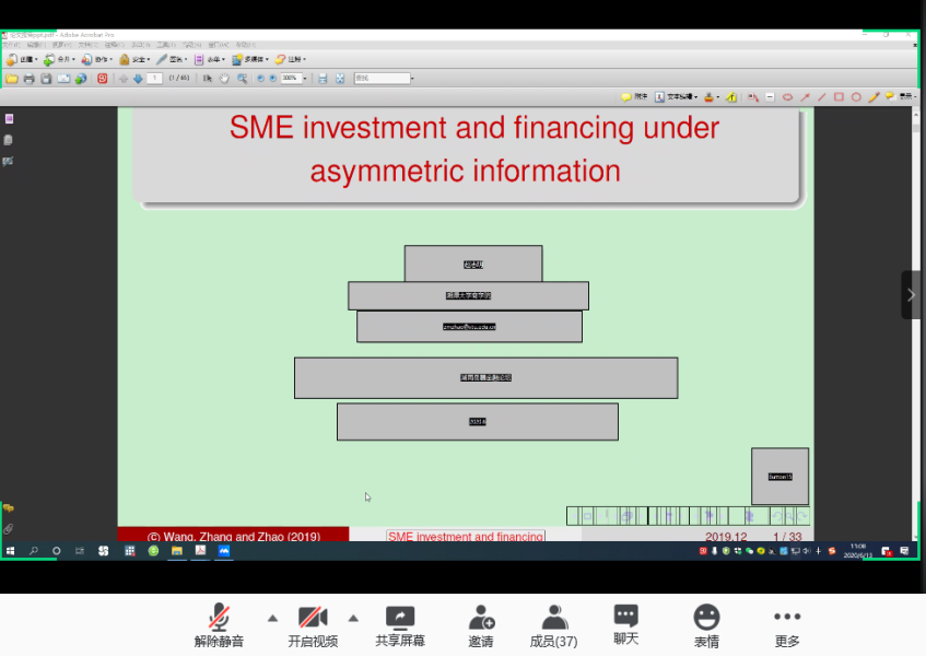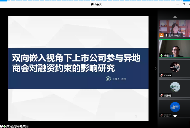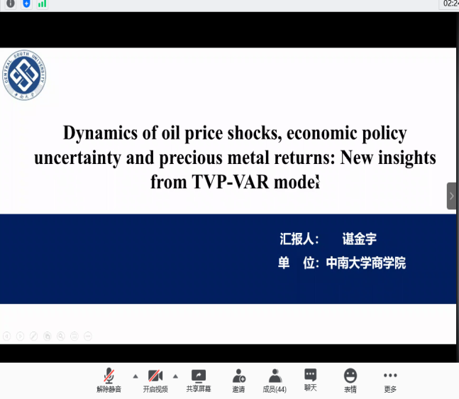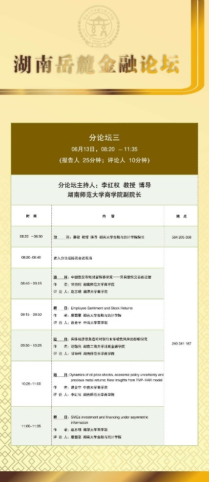 分论坛三由湖南师范大学商学院副院长李红权教授主持,首先由湖南师范大学商学院甘顺利助理教授汇报《中国股票市场财富转移研究——来自股权交易的证据》,本文以2007年第1季度至2019年第4季度中国上市公司股权交易为研究对象,估算了资金空转的收益,并考察了资金空转收益的决定因素;接下来由 韩漫 唐国豪助理教授汇报《Employee Sentiment and Stock Returns》,文章提出了员工情绪指数,作为投资者情绪与经理人情绪的补充,并在样本内和样本外发现了高员工情绪指数能够负向预测未来股票收益;接着湖南工商大学财政金融学院胡锡亮助理教授汇报《实体经济债务违约对银行业系统性风险的影响研究》,本文基于Merton(1974)的标准CCA方法,分析了实体经济债务违约对银行业系统性风险的非线性激增机制,明晰了Nagel & Purnanandam(2020)修正CCA方法嵌入的银行股权与负债“期权的期权”与银行资产收益非线性特征;接下来由中南大学商学院谌金宇副教授汇报《Dynamics of oil price shocks, economic policy uncertainty and precious metal returns: New insights from TVP-VAR model》,基于时变参数矢量自回归(TVP-VAR)模型,研究使用1990年4月至2018年4月的月度数据,着重分析了油价冲击和经济政策不确定性对贵金属收益的动态影响;最后由湘潭大学商学院赵志明助理教授汇报《SMEs investment and financing under asymmetric information》,研究在信息不对称的动态环境中受财务约束的中小企业的投资时机和融资决策。