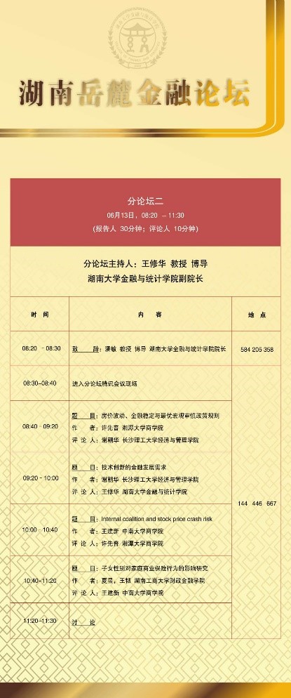 分论坛二由 韩漫 副院长王修华教授主持。首先由长沙理工大学经济与管理学院谢朝华副教授汇报《技术创新的金融发展需求》,认为金融业在结构、功能、效率和安全等四个方面还有较大的发展空间和较强的紧迫性,金融服务技术创新需要练好四大基本功;接下来由湘潭大学商学院许先普副教授汇报《房价波动、金融稳定与最优宏观审慎政策规则》,研究基于植入金融因素的房价波动DSGE模型,分析了不同宏观审慎工具对房价波动的调控效果、作用机制以及最优政策组合等问题;接着由中南大学商学院的王建新副教授汇报论文《Internal coalition and stock price crash risk》,文章检验了内部结盟对2000至2014年间股票崩溃风险的影响,基于任命的内部结盟对股票崩溃风险有正向和重大影响;最后由湖南工商大学财政金融学院王韧教授汇报论文《子女性别对家庭商业保险行为的影响研究》,本文运用Probit和Tobit回归的方法,利用2013年、2015年及2017年三年中国家庭金融调查截面数据研究了家庭对于商业保险投资在一定程度上存在对子女的性别偏好的问题。