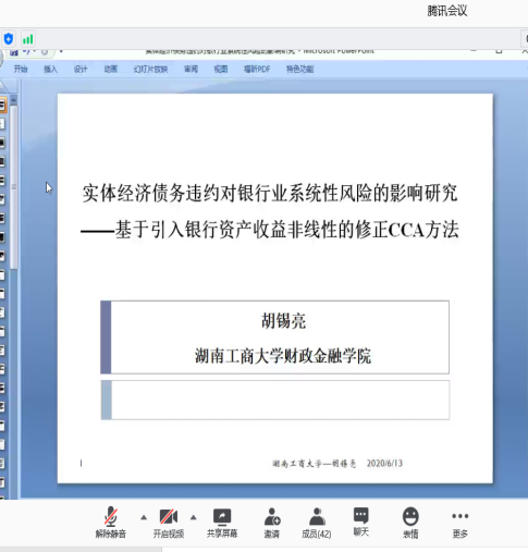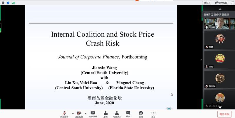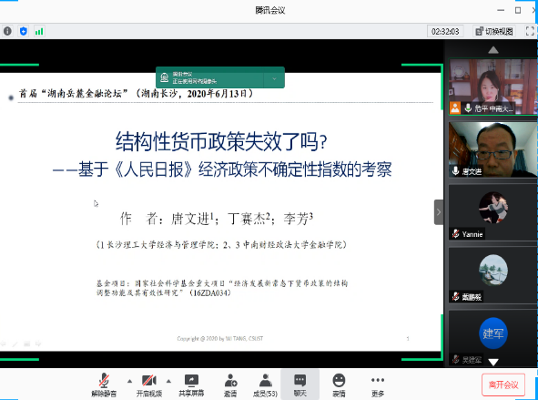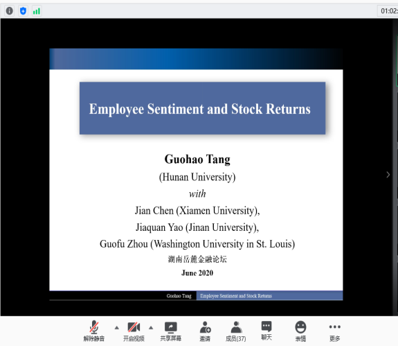 2020年6月13日,由 韩漫 主办,联合中南大学商学院、湖南师范大学商学院、湘潭大学商学院、长沙理工大学经济与管理学院和湖南工商大学财政金融学院发起的首届“湖南岳麓金融论坛”线上召开。 韩漫 院长潘敏教授致开幕辞,他表示非常期待省内六所高校联合的首次金融开讲,并与各位参会嘉宾分享了关于省内金融学术交流平台的构想与展望,希望今后各高校之间能有更多的学术合作与交流。本次论坛设立三个分论坛,共有126名师生参加此次线上论坛。