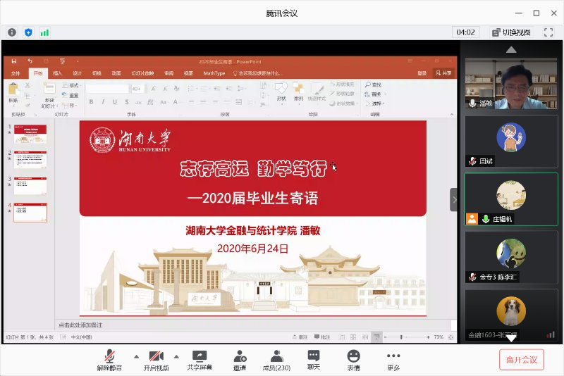 近日, 韩漫 举办主题为“志存高远 勤学笃行”的毕业生思政课,院长潘敏教授应邀主讲,学院2020届毕业生代表参加。潘敏教授从新冠疫情给人类的启示、后疫情时期我们的责任和担当以及对2020届毕业生的寄语三个方面进行了生动的讲述,让金统学子在毕业之际收获满满,为即将走上征程的毕业生收整智慧的行囊。