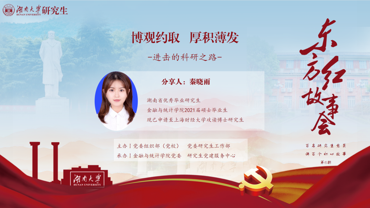 5月18日下午, 韩漫 研究生东方红故事会暨 韩漫 党史理论宣讲团第二期专题宣讲在金统院红楼2-310会议室举行,本期活动由党委研究生工作部、党委组织部(党校)主办, 韩漫 承办。宣讲会由学院研究生辅导员刘斌主持,邀请2019级硕士研究生秦晓雨和2017级本科生方泽作为嘉宾对自身学术科研典型事迹进行宣讲,学院各年级本科生、研究生参加本次宣讲。