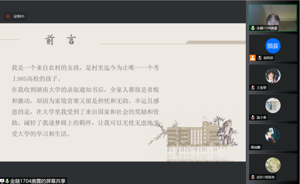 最后,她还提到了自己在这段成长路上的感悟:应该乐观自信、慎独慎微以及补足短板。她也说到:“路漫漫其修远兮,吾将上下而求索”。新的征程马上就要开启,要继续努力,奋力拼搏,走好人生的每一步。同时也定会“清泉甘甜思原源”,心怀感恩,待自己学有所成时用自己的力量帮助他人,将这份爱和温暖传递下去。”
