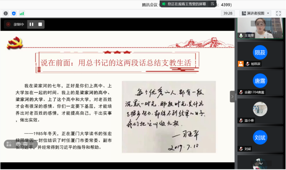 王雪雯介绍了志愿服务期间教育扶贫工作。在支教过程中,王雪雯坚持探索公益、进行文化传播,通过开通宣传微博等,悉心帮助各个留守儿童。同时,她也没有落下自身学习,参加了“中金所杯”全国大学生金融知识大赛并获三等奖。此外,王雪雯也分享了在支教中经历的酸甜苦辣,即使面对着农村教学、生活环境上的恶劣条件,也不断调整心态,最终与孩子们和同事们结下了深刻的友谊,收获了更加吃苦耐劳、平和坚强的自己。