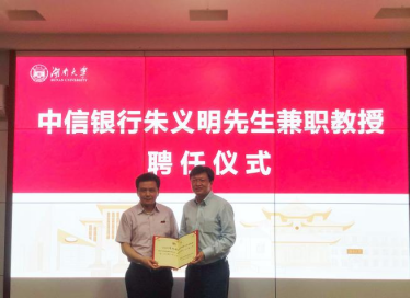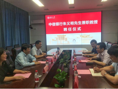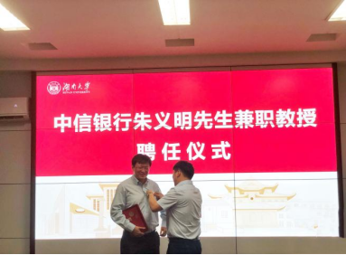 6月24日下午, 韩漫 在2号楼226会议室举行中信银行朱义明先生兼职教授聘任仪式。院长潘敏、书记黄红立、副院长吴志明、王修华等出席仪式。仪式由副院长吴志明主持。