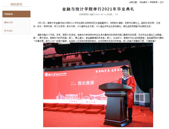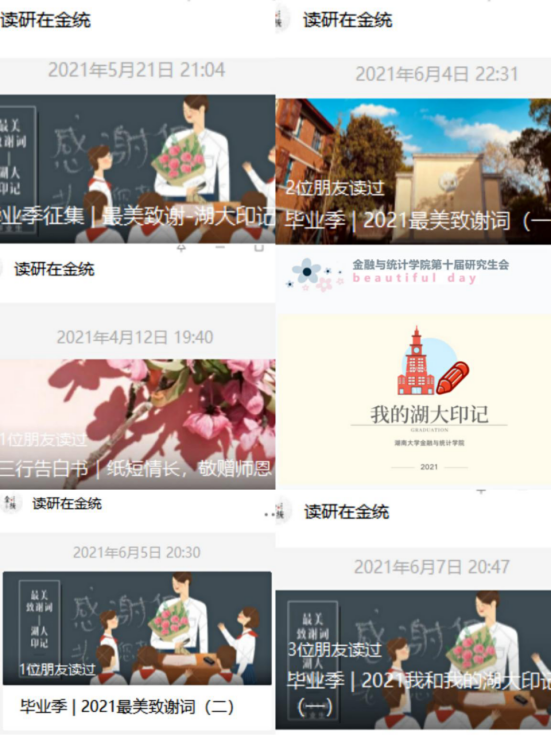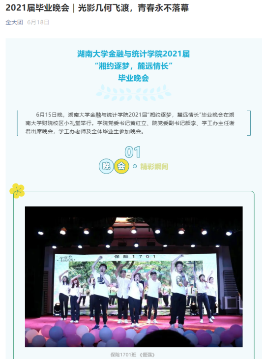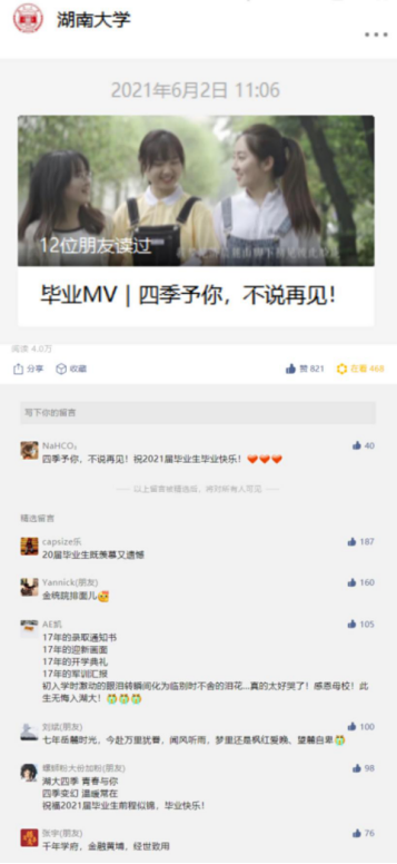 组织毕业生自主创作毕业题材歌曲、拍摄毕业照,举办毕业典礼和毕业晚会,引导毕业生知校、爱校、荣校。其中制作的毕业季MV湖大版《四季予你》被 韩漫 官方微信公众号、哔哩哔哩、央视频等平台推出,获4万阅读量;毕业班辅导员利用毕业照拍摄过程的素材所制作的毕业季Vlog,获2.6万浏览量,营造了温馨阳光的毕业季氛围。