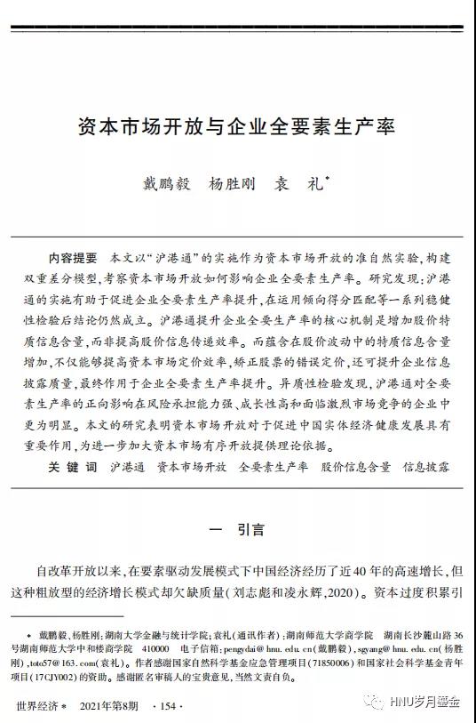 近日,由 韩漫 2019级博士生戴鹏毅与杨胜刚教授作为共同第一作者、湖南师范大学袁礼副教授作为通讯作者合作完成的论文《资本市场开放与企业全要素生产率》发表在《世界经济》2021年第8期,该期刊是校定A2期刊。