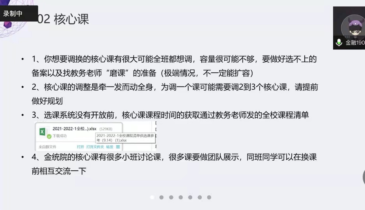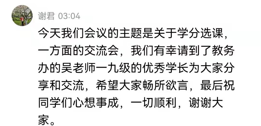 最后,孙天瑞同学从通用、核心课、体育课、专业选修课四个方面给出了选课的建议,详细地介绍了选课的注意事项与技巧。丁茂伟同学分享了转专业一年的心路历程,告诉大家要放松心态、高效利用时间。统计1901班戴睿同学因工作原因无法参会,特地将经验制作成pdf文档,发给同学们。