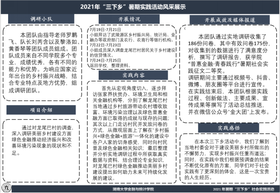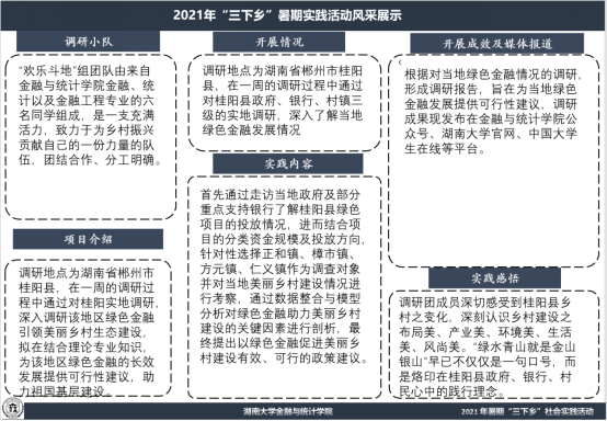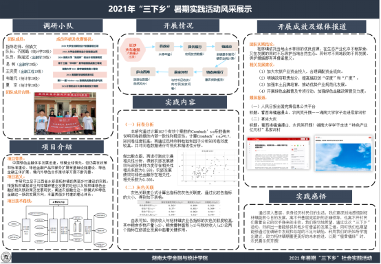 团队由 韩漫 六名同学组成,调研地点为湖南省郴州市桂阳县,在一周的调研过程中通过实地调研,希望能够深入调研该地区绿色金融引领美丽乡村生态建设,拟在结合理论专业知识,为该地区绿色金融的长效发展提供可行性建议,用一己之力,助力祖国基层建设。