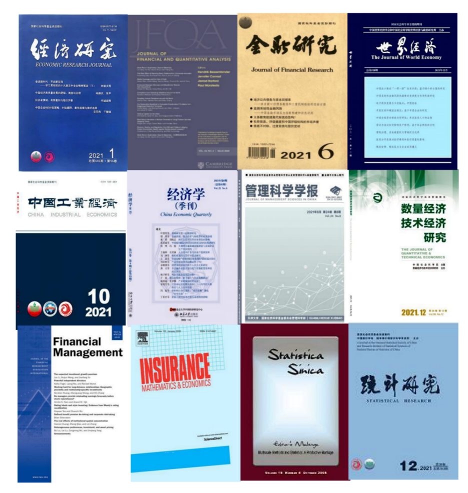 本年度,学院教师共发表论文106篇,其中院定A类及以上论文19篇。在《经济研究》发文2篇,在《金融研究》发文3篇,在《世界经济》发文2篇,在《中国工业经济》发文2篇,在《数量经济技术经济研究》发文3篇,在《管理科学学报》发文1篇,在《经济学季刊》发文1篇,在《统计研究》发文1篇,在《Journal of Financial and Quantitative Analysis》、《Statistica Sinica》、《Insurance: Mathematics and Economics》、《Financial Management》各发文1篇。