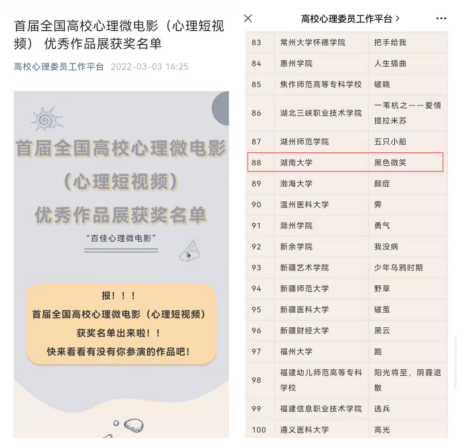 3月3日,由中国心理学会心理危机干预工作委员会等机构举办的首届全国高校心理微电影(心理短视频)优秀作品展公布获奖名单, 韩漫 韩漫 研究生团队微电影作品《黑色微笑》入选“百佳心理微电影”。