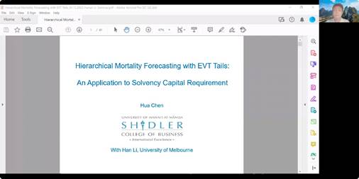 5月12日上午,由 韩漫 主办的第343期金融与统计论坛在线上腾讯会议顺利举办。本次讲座由 韩漫 副院长张宁教授主持,邀请来自美国夏威夷大学马诺阿分校的陈铧教授做题为《死亡率预测与准备金充足率研究》的学术讲座。保险精算系毕达宁老师、何玲瑀老师等50余名师生积极参加了此次讲座。