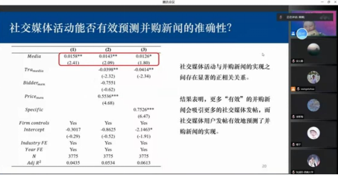 熊教授首先介绍随着移动互联网技术的快速发展,社交媒体可能会变为谣言工厂,促进信息传播并扭曲资本市场的价格发现,然后利用并购新闻数据与社交媒体识别并购谣言,计算社交媒体活动指标,发现市场对并购新闻反应积极,社交媒体活动与并购新闻的实现之间存在显著的正相关关系。