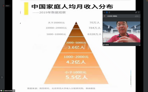 报告伊始,黄泰岩教授从2035年中国共同富裕的远景目标出发,依据共同富裕的发展内涵与目标,分析了目前共同富裕取得的实质性进展,通过参考世界银行提出的标准指出中国的共同富裕发展建设还有很长的路要走。他从2035年远景目标、国内外对中国中产家庭的研究和中国家庭收入分析数据三个角度论证并阐述了共同富裕发展的方向,强调了扩大中等收入群体的重要性和紧迫性。随后,黄泰岩教授从金融与稳就业、金融与创新创业和金融与财产性收入三个角度,分析了金融如何促进低收入群体收入翻番的途径,并指出只有金融的支持,共同富裕才能取得更为实质性的进展。