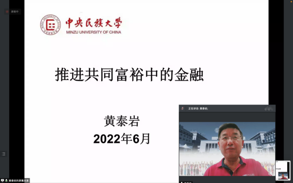2022年6月24日下午,中央民族大学原校长、中国兴边富民战略研究院院长黄泰岩教授应邀作题为“推进共同富裕中的金融”的学术报告,讲座由学院副院长王修华教授主持,共计两百余名师生聆听了此次讲座。