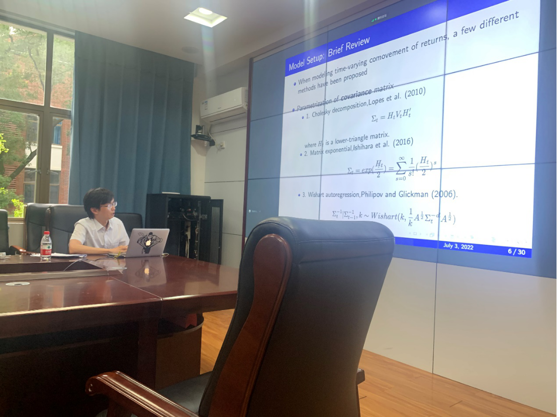陈汉助理教授报告的题目是“Multivariate Stochastic Volatility Models based on Generalized Fisher Transformation”。陈汉助理教授研究的问题是对收益率序列建立多元波动率模型。他们指出在单变量模型中,一个常见的做法是对数据作对数变换确保时变波动率的符号为正。但是对于多元波动率模型,如何保证时变协方差矩阵是正定的是一个重要的研究问题。他们提出了基于广义费雪变换的多元随机波动率模型。与文献中的方法对比,该模型具有易解释、对于相关系数的估计不受数值限制等特点。他们提出使用Particle Gibbs Ancestor Sampling方法来做统计推断。进一步地, 他们展示了大量数值模拟结果,结果表明新提出的方法具有良好的有限样本表现。最后,通过考虑多个汇率序列的来说明所提方法的应用。