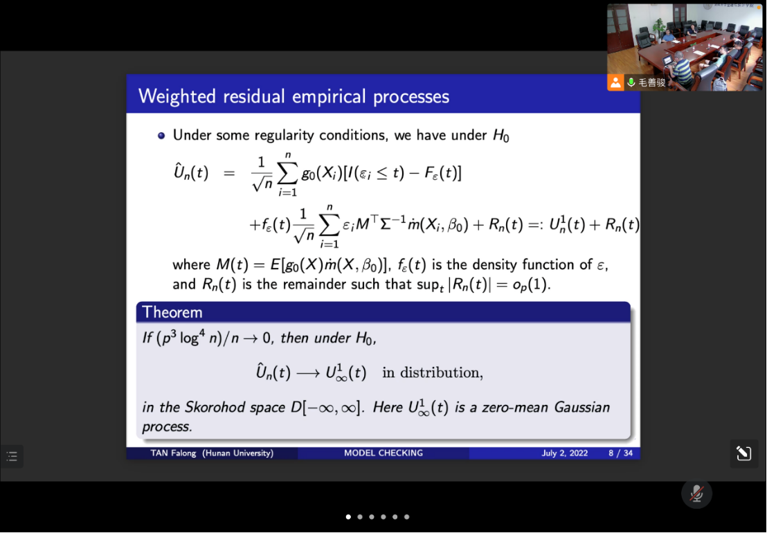 谭发龙副教授的报告题目是“Weighted residual empirical processes, martingale transformations, and model checking for regressions”。由于传统模型检验方法会遭受维数祸根问题,谭发龙副教授提出了一种基于加权残差经验过程及其鞅变换的新方法。该方法基于残差的示性函数来避免维数祸根问题,并且鞅变换使得该方法是渐近分布自由的,从而避免了维数祸根问题;进一步研究可以发现基于鞅变换的方法只能检测n^(-1/4)速度趋于原假设的局部备择假设,这一发现完全不同于现有文献中的结论。最后通过数值模拟和实际数据的来说明新的检验统计量的有效性。