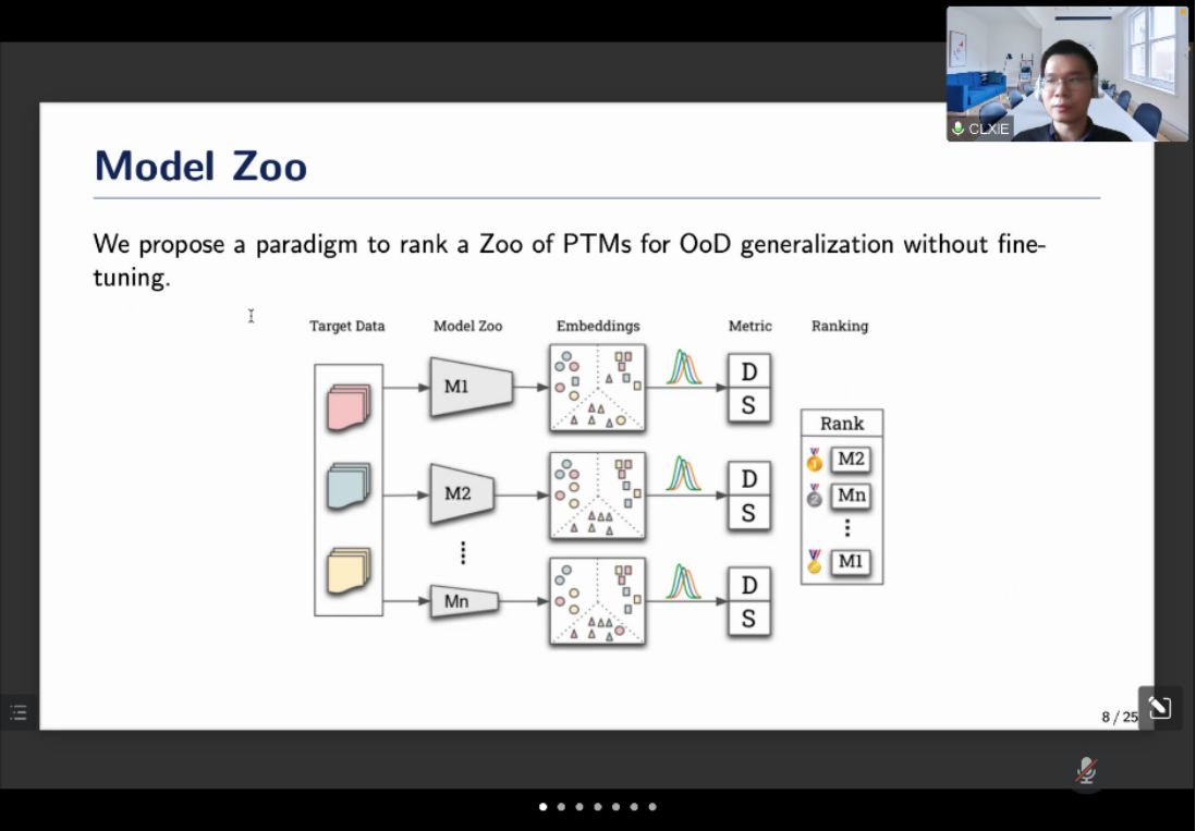 随后,谢传龙副研究员报告了他最新的研究工作《Exploting model zoo for out of distribution generalization》。Out of distribution generalization(OOD)问题是指测试样本与训练样本分布的不同而引起的模型泛化问题,大多数学者通过预训练来提高OOD泛化能力。在常用的深度学习的框架下,通常能找到很多针对数据集的训练好的预模型。谢传龙副研究员在其报告中提出一种方法,能够衡量模型在不同数据间的迁移效率,包括correlation shift和discriminability,对备选模型进行打分和排名,能针对特定数据集衡量众多预训练模型的泛化能力,以便快速地找到适用于该数据集的最优预训练模型。