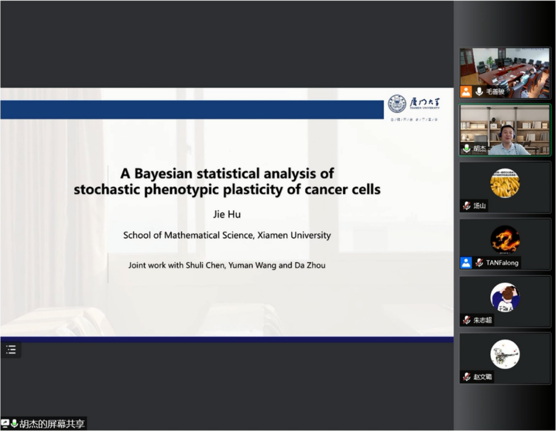 胡杰副教授报告的题目是“Beyesian statistical analysis of stochastic phenotypic plasticity model of cancer cells”。胡杰副教授首先介绍了癌细胞表型可塑性的背景,虽然相关的模型在数学性质方面已经得到了广泛的研究,但对参数估计和模型选择的统计分析仍然非常缺乏,因此胡杰副教授提出了一种蕴含连续时间信息的贝叶斯方法,用于处理癌症干细胞(CSCs)转化概率的均值和方差信息的数据集,并用大量的模拟实验证明了该模型和算法的有效性;最后将该方法应用于SW620结肠癌细胞的数据,研究发现相对于传统的癌细胞分级模型,模型选择更倾向于表型可塑性模型。