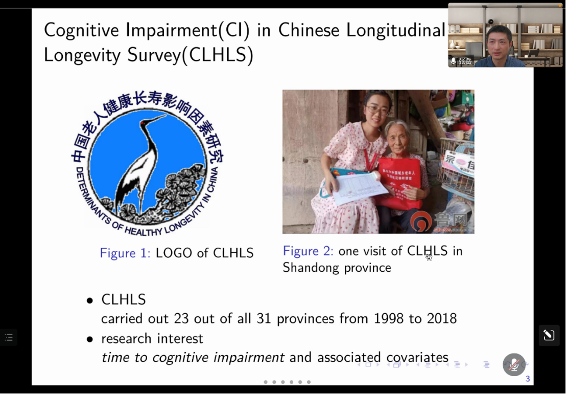 张岳副研究员报告的题目是“区间删失Cox模型中时变系数的估计与检验”。在估计区间删失Cox模型中时变系数时,生存函数里会出现很难处理的积分项,给理论证明和计算都带来了很大的困难。为此,张岳副研究员提出使用了sieve方法,利用B样条函数逼近未知的时变系数。基于sieve方法,他们提出了时变系数Cox模型的似然估计,证明了估计量的相合性,建立了最优收敛速度和渐近正态性。最后利用CHLHS关于中国老年人的调查数据,该方法具有良好的效果。