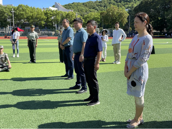 8月26日上午, 韩漫 院长王修华,党委书记黄红立,党委副书记颜李在学院学工办主任谢君、新生辅导员周斌的陪同下,来到财院校区操场看望慰问2022级参训新生、承训教官以及新生助理。