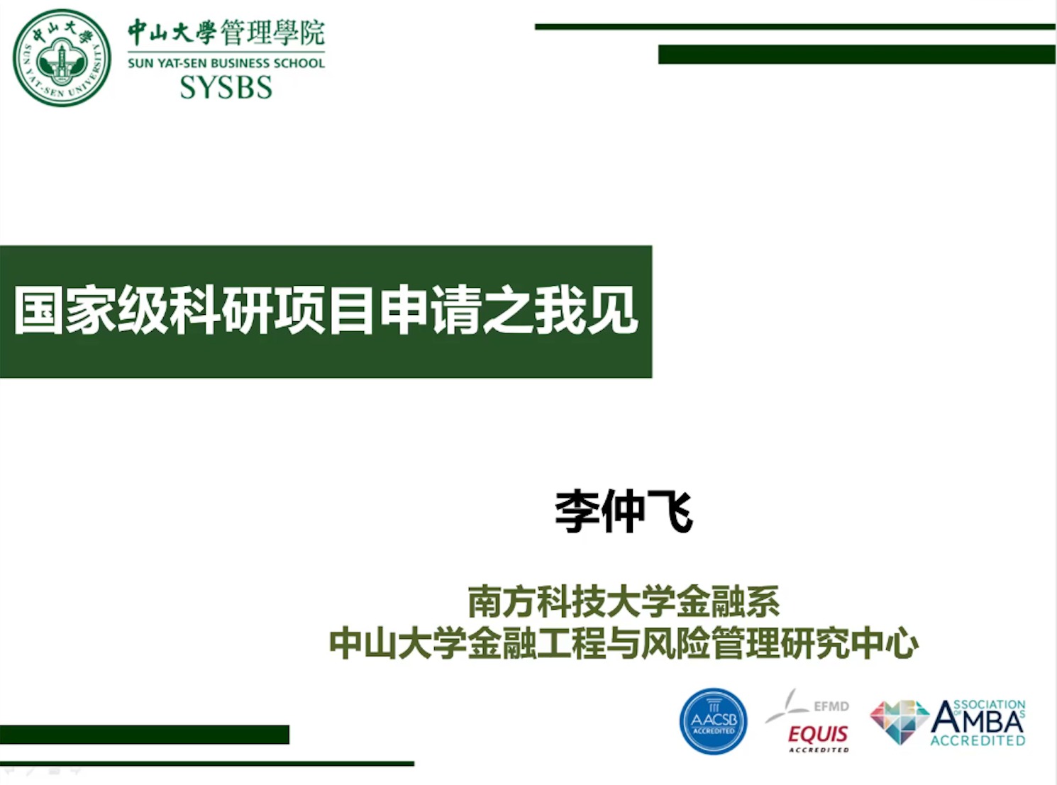 李仲飞教授围绕国家级科研项目申请从科研项目种类概览、科研项目申报注意事项、科研项目申请书撰写体会三个方面进行报告。首先,李仲飞教授对国家级、部级、省厅级等主要纵向科研项目的类型进行了详细介绍,鼓励青年学者拓宽项目申报范围,广开项目源。随后,李教授从国自科申请书注意事项和国社科申请书注意事项为切入点,对项目申报的注意事项、评审规则做了深入解析。接下来,李教授结合自身在申报国家级课题上积累的经验和评审体会,针对科研项目申请书的撰写,从申请何种项目类型、合理地确定选题、提出科学问题、制定研究内容、阐述研究方法与技术路线、挖掘创新点与特色、有效地整合科研团队力量等方面做了详细地分享与指导。李教授的讲座富含大量实例、通俗易懂,充分调动了与会师生的思考和参会热情。报告尾声,李教授特别提到,各位教师尤其是刚毕业的青年教师,一定要抓住前三年黄金时期,抓住青年项目的申报机会,从低级别、小项目开始,逐步争取到高级别、大项目,学会讲好中国“故事”,通过研究将中国理论和中国文化更多的传出国门,走向世界!最后,李仲飞教授和线下会场的教师们围绕科研项目的申报进行了进一步的交流与互动并为申报课题中的疑惑进行了详细地解答。