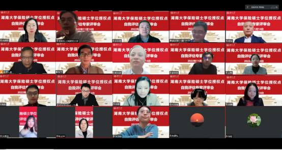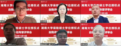 保险硕士学位授权点自我评估专家评审会专家组由全国保险专业学位研究生教育指导委员会委员、上海财经大学金融学院曾旭东教授担任组长,成员包括全国保险专业学位研究生教育指导委员会委员、厦门大学经济学院赵正堂教授,复星联合健康保险股份有限公司副总经理、总精算师关娇阳,财信吉祥人寿保险股份有限公司产品精算部及个险部总经理屠炎波,大家人寿保险股份有限公司湖南分公司总经理何琼。