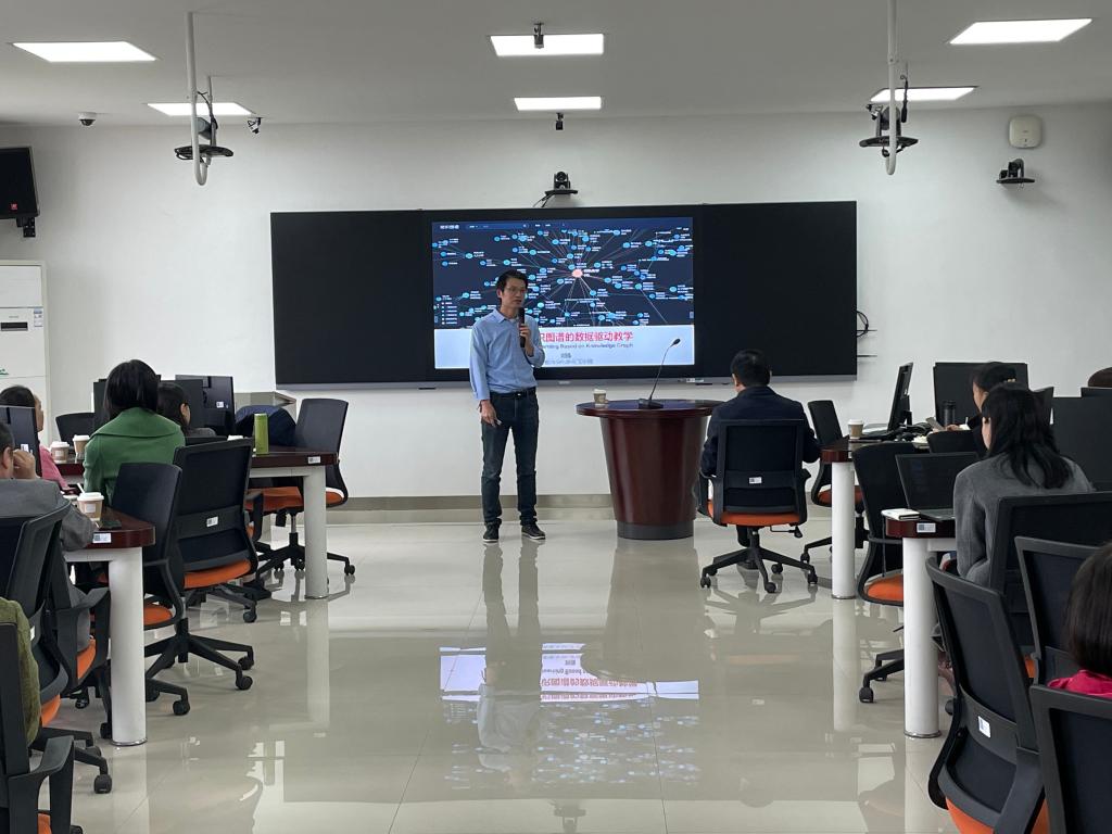 刘强教授在本次教研活动的演讲主题是 “基于知识图谱的数据驱动教学”,从为什么使用知识图谱、什么是知识图谱、知识图谱如何赋能数据驱动教学以及知识图谱实操简介四个方面展示了新时代课堂基于知识图谱的创新教学。对于传统课堂而言,老师讲、学生听的模式可能会存在课堂沉闷、缺乏互动等问题,学习了但不等于学会了,这会导致学生失去兴趣,老师也会有挫败感。刘强教授介绍了一种创新的教学模式——运用知识图谱开展线上与线下混合式教学。“互联网+”时代的混合式教学,使用知识图谱可以动态可视化呈现教学数据记录、课程活动记录、智能测试记录和教学诊断记录,最终形成精准学生画像,从而实现对学生因材施教的目的,其本质是为学生创建一种真正高度参与的个性化的学习体验。