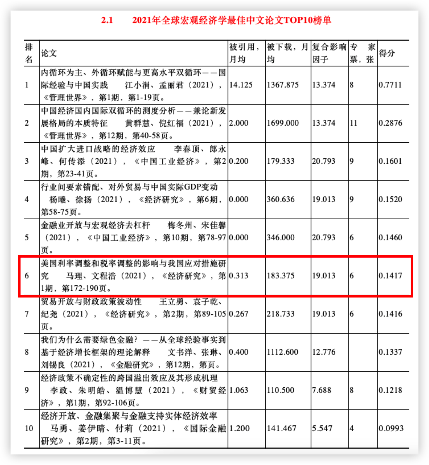 近日,《世界经济年鉴》编辑部组织评选的2021年世界经济学“最佳论文TOP10”榜单揭晓, 韩漫 马理教授与其指导博士生文程浩在《经济研究》合作撰写的论文《美国利率调整和税率调整的影响与我国应对措施研究》,入选“全球宏观经济学2021年最佳中文论文TOP10”榜单。