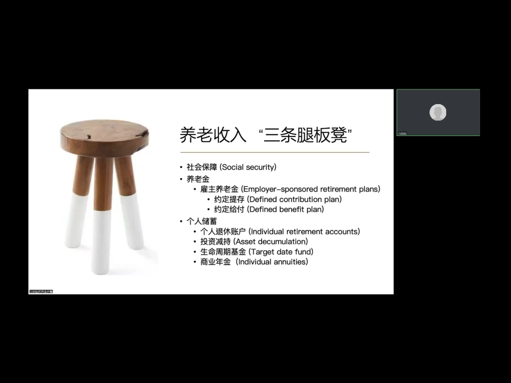在《养老规划的现状与未来》的专题讲座部分,冯教授详细地介绍了以社会保障、雇主与商业养老金、个人储蓄作为三大支柱的养老收入体系。自上世纪80年代以来,采用约定给付的雇主养老金逐渐向约定提存转化。商业养老金常见的产品有固定年金、投资连结年金和变额年金。其中,变额年金接近于投资产品,具有更高的收益,在美国的商业养老金构成中,变额年金占据相当大的比例。此外,个人储蓄作为养老体系的第三支柱一般有个人退休账户、资产减持和生命周期基金三种方式。冯教授从功能、原则、特点、风险以及发展等维度比较了各类养老资产的异同。社会保障由政府主导,保证了人们的最低收入,可以解决基本的温饱问题,遵循社会公平的原则,采用代际转移的方式即将年轻人劳动力的收入转移给年长的人维持社会保障基金的可持续性。若国家的设计得当,社会保障可以抵抗通胀和长寿风险。雇主和商业养老金由市场主导,强调生活品质,关注的是个体精算平衡,采用代内转移的方式,但是难以抵抗长寿和通胀风险。个人储蓄则是为了进一步提升生活质量,实现理想目标而进行的储蓄。以自给自足的方式,实现收入的生命周期内转移。此种方式下,人们能够选择的投资资产种类有限,且面临的风险较高,储蓄主体需要具备一定金融知识。在护理方面,冯教授介绍了美国流行的长期护理产品,由护理水平的从低到高分为上门照料、辅助生活社区以及养老院三种,其费用主要来自政府支出。在医疗方面,美国是唯一一个没有全民医保的发达国家,国民通过雇主、慈善机构等提供的医疗保险来覆盖医疗支出。冯教授还向大家解释了一个著名的经济学问题——“年金困惑”,指出人们考虑到资金的流动性,会做出与理论研究相反的决定,相比于固定的、具有持续性的年金来说更愿意选择一次性的大额收入。冯教授指出年金销售也具有框架效应,人们过度相信自己的投资能力,缺乏对专业管理机构的信任。在解释年金的收益时,以消费为框架还是投资为框架会影响保户的理解。