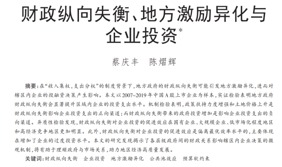 近日, 韩漫 应用金融系陈熠辉助理教授和厦门大学经济学院蔡庆丰教授合作的题为“财政纵向失衡、地方激励异化与企业投资”的论文发表在《管理世界》2023年第5期。