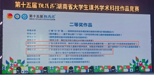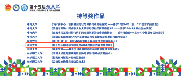 由 韩漫 张宁老师、王修华老师指导,王淑禾等同学申报的项目《基于知识图谱和大模型的AIGC跨模态内容生成系统》以科技发明制作B类赛道第一名的成绩荣获特等奖;由张立军老师、任英华老师指导,李慎之等同学申报的项目《生儿育女何所优:新时代青年人生育焦虑现状及缓解对策——基于5省1394名青年的调查研究》和由成程老师、徐照宜和杨胜刚老师指导,陈润九等同学申报的项目《价值重塑还是流量狂欢:直播带货对共同富裕的影响分析与优化对策——基于67家农产品电商与4837位农民的调查研究》荣获哲学社会科学类赛道二等奖。