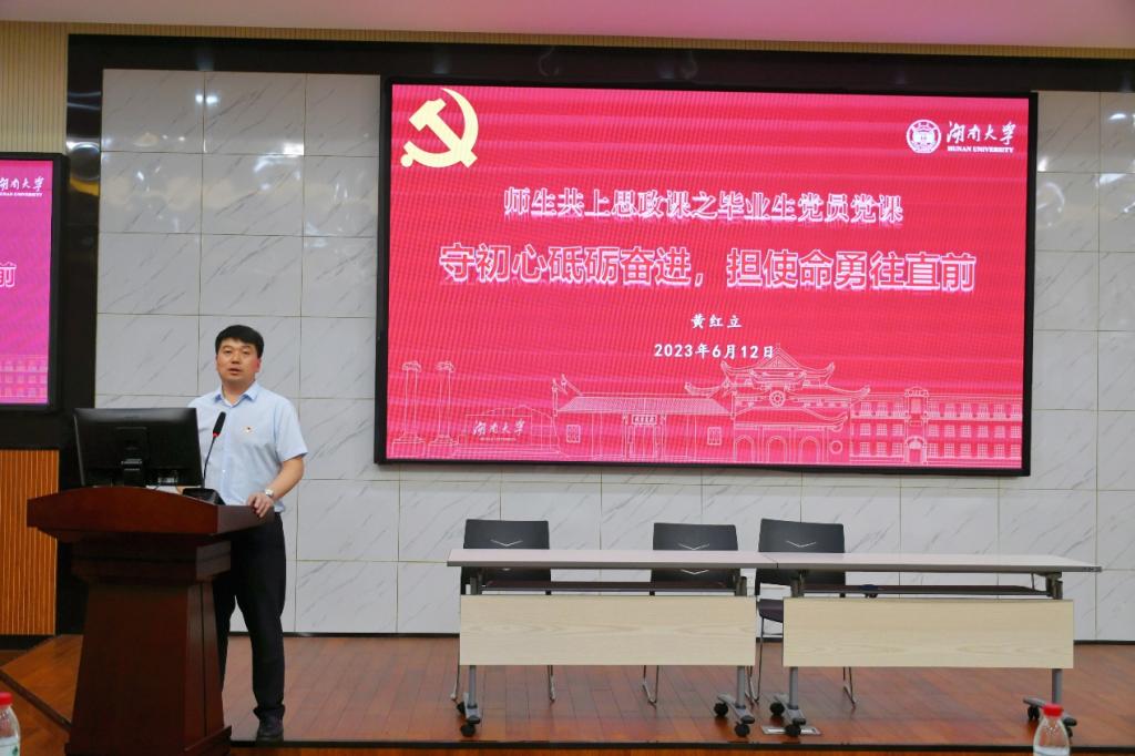在和同学们回顾历次党代会上的湖大人,带领毕业生党员与历史对话,黄红立书记希望大家牢记习近平总书记“不负青春韶华、不负时代重托”的殷殷嘱托,在以后的学习与工作生活中以实际行动为母校争光,为党旗添彩!