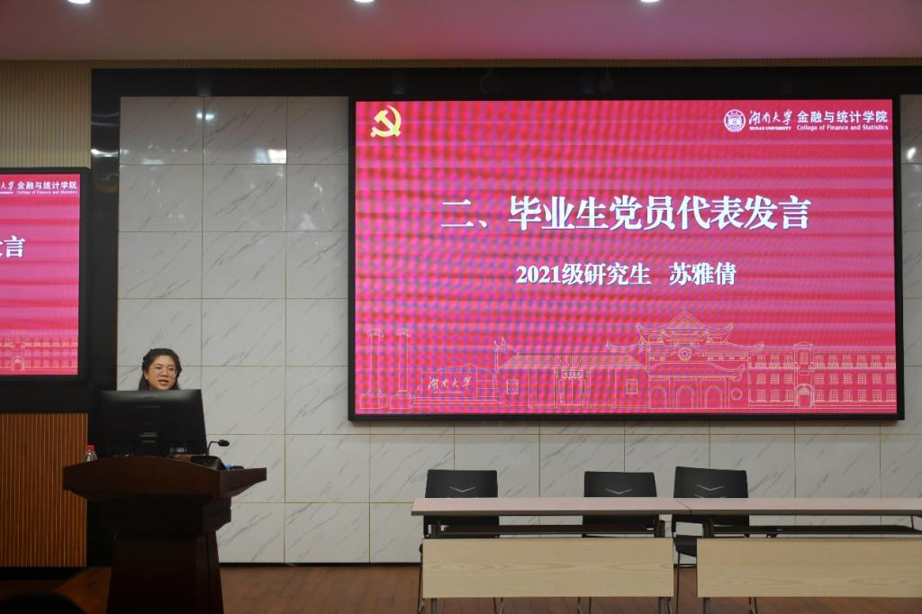 毕业生党员代表苏雅倩同学在发言中表示:在聆听黄书记的党课后受益匪浅。在启程新篇章之际,她向所有毕业生发出倡议:“夯理论之果,筑思想阵地”“感师恩永沐,固守初心路”“铭党员身份,肩使命长存”,希望同为毕业生的大家能够共同努力,不负青春、不负韶华、不负时代,走好人生道路。
