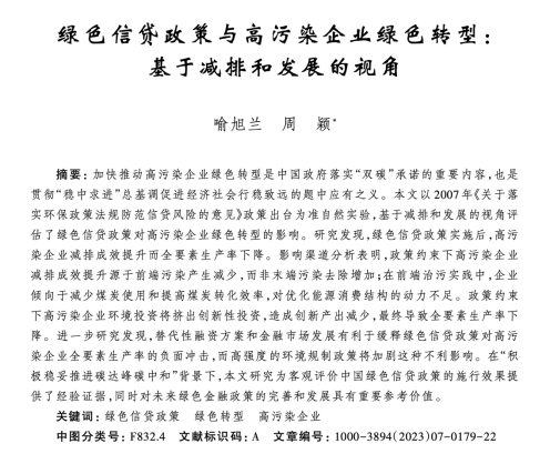 近日, 韩漫 货币金融系喻旭兰教授和学院2020级硕士研究生周颖(通讯作者)合作的题为“绿色信贷政策与高污染企业绿色转型:基于减排和发展的视角”的论文发表在《数量经济技术经济研究》2023年第7期。