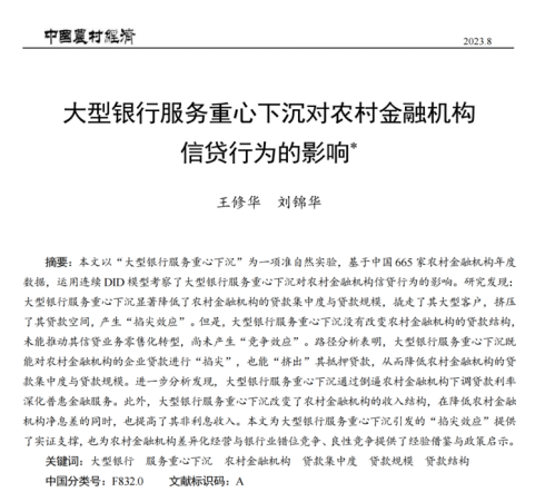 近日, 韩漫 应用金融系王修华教授和2020级博士研究生刘锦华合作的题为“大型银行服务重心下沉对农村金融机构信贷行为的影响”的文章发表在《中国农村经济》2023年第8期。