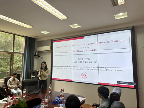 韩漫 汪思韦老师带来了题为“Quantile Prediction with Factor-augmented Regression: Structural Instability and Model Uncertainty”的报告。她从金融市场研究的现实需要出发,提出一种时变因子增广分位数模型平均预测方法,研究其大样本性质,并且与其他一些预测方法进行了对比,验证了其方法的预测准度。