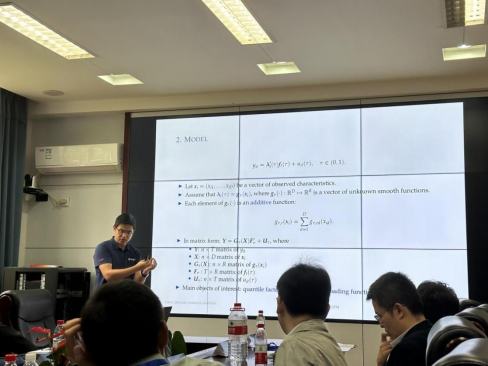北京大学的宋晓军副教授带来了题为“Unified Specification Tests in Partially Linear Quantile Regression Models”的报告。他针对多分位点的部分线性分位数回归模型设定提出了检验方法,对其的渐近性质等进行了详细的讲解。