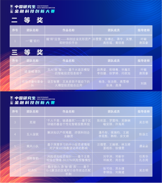 本届大赛自六月启动以来,来自120个培养单位、291支队伍的1780位师生锚定国家发展需求,围绕金融科技创新主题,共同为这一领域实际问题的解决提出了创造性的方案,贡献了青年力量。经过多个赛程的激烈角逐,大赛最终产生了7支一等奖队伍(金奖1支、银奖2支、铜奖4支),17支二等奖队伍,57支三等奖队伍。另评选出20家优秀组织单位。