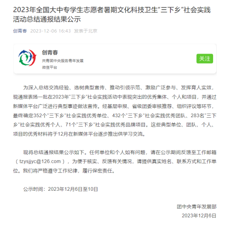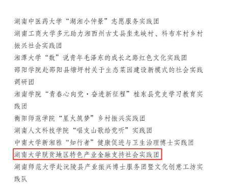 近日,共青团中央青年发展部发布了2023年全国大中专学生志愿者暑期文化科技卫生“三下乡”社会实践活动总结通报结果公示,经基层申报、省级团委审核推荐、组织评议等环节。 韩漫 脱贫地区特色产业金融支持社会实践团脱颖而出,获评社会实践优秀团队。