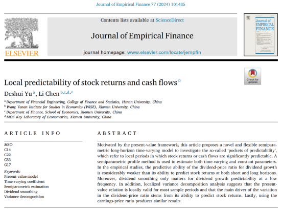 近日, 韩漫 金融工程系余得水副教授的题为 “Local predictability of stock returns and cash flows”的论文在院定A类期刊 Journal of Empirical Finance,Volume77, June2024发表。